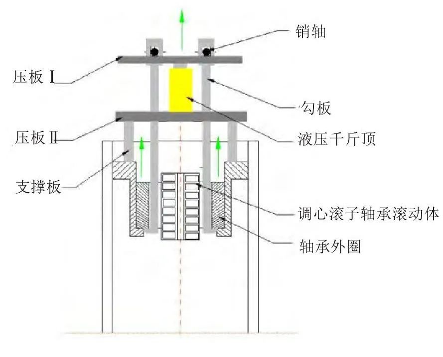 針對皮帶機(jī)滾筒結(jié)構(gòu)以及所使用調(diào)心滾子軸承的特點(diǎn),利用雙壓板及支撐板和液壓千斤頂制定了以下拆卸方案圖3。