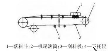 對于帶式輸送機(jī)來說,其落料斗通常設(shè)置在機(jī)尾位置,如下圖所示,當(dāng)物料下落后,由輸送帶運送至機(jī)頭,在這個過程中,由于矸石等雜質(zhì)的存在,在物料通過漏斗時,一旦矸石過大,則矸石會卡在漏斗壁與輸送帶之間,由于輸送帶運行速度的原因,在短時間內(nèi)輸送帶就會發(fā)生斷裂,因此要想防止輸送帶發(fā)生早期破壞,則應(yīng)該對落料漏斗進(jìn)行改造。