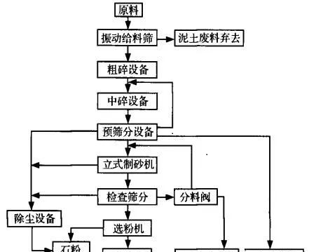 圖1所示為典型的干法生產(chǎn)工藝流程,原料經(jīng)過振動(dòng)給料篩和篩分機(jī)組合篩除泥土以后,一般要經(jīng)過粗碎和中碎兩道破碎后再進(jìn)行檢查篩分,通過篩分將礦石分成3個(gè)部分: